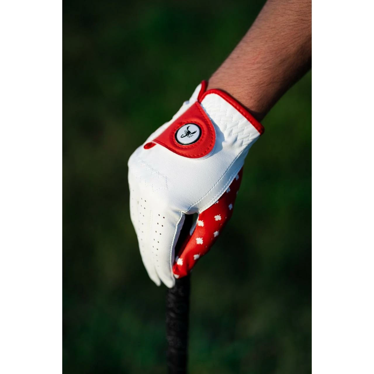 Tip your hat to the nation that produced golf greats Mike Weir and George Knudson with this red-and-white, maple-patterned beauty of a glove. Our signature scorpion ball marker is conveniently attached to the tab so it’s always at your fingertips. Premium Cabretta leather and synthetic upper join forces to create a glove that fits like a second skin and lets your hand breathe, so your grip is solid and consistent with every swing.