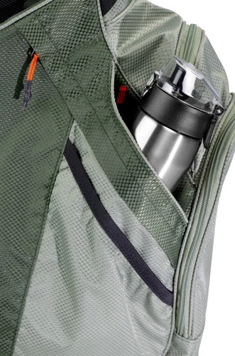 Nine pockets include a full-length clothing pocket, hydration pouch, multiple accessory pockets and a water-resistant, velour-lined valuables pocket.